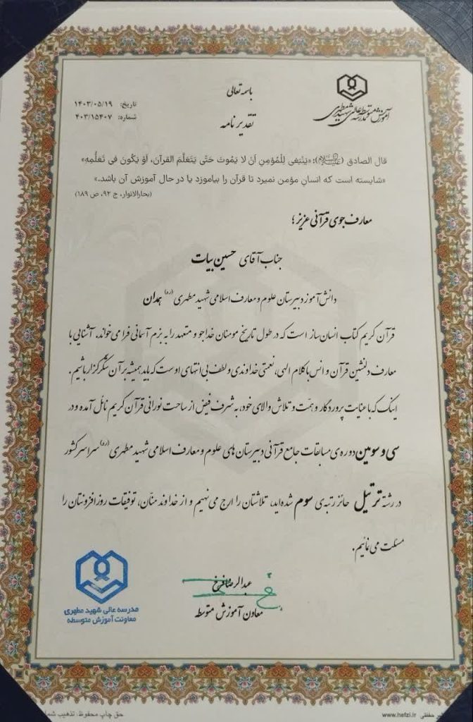 شایان ذکر است چندی پیش آقای حسین بیات با کسب رتبه سوم کشوری در رشته حفظ آیات الهی در مسابقات قرآنی آموزش و پرورش کشور نیز افتخار آفرید.