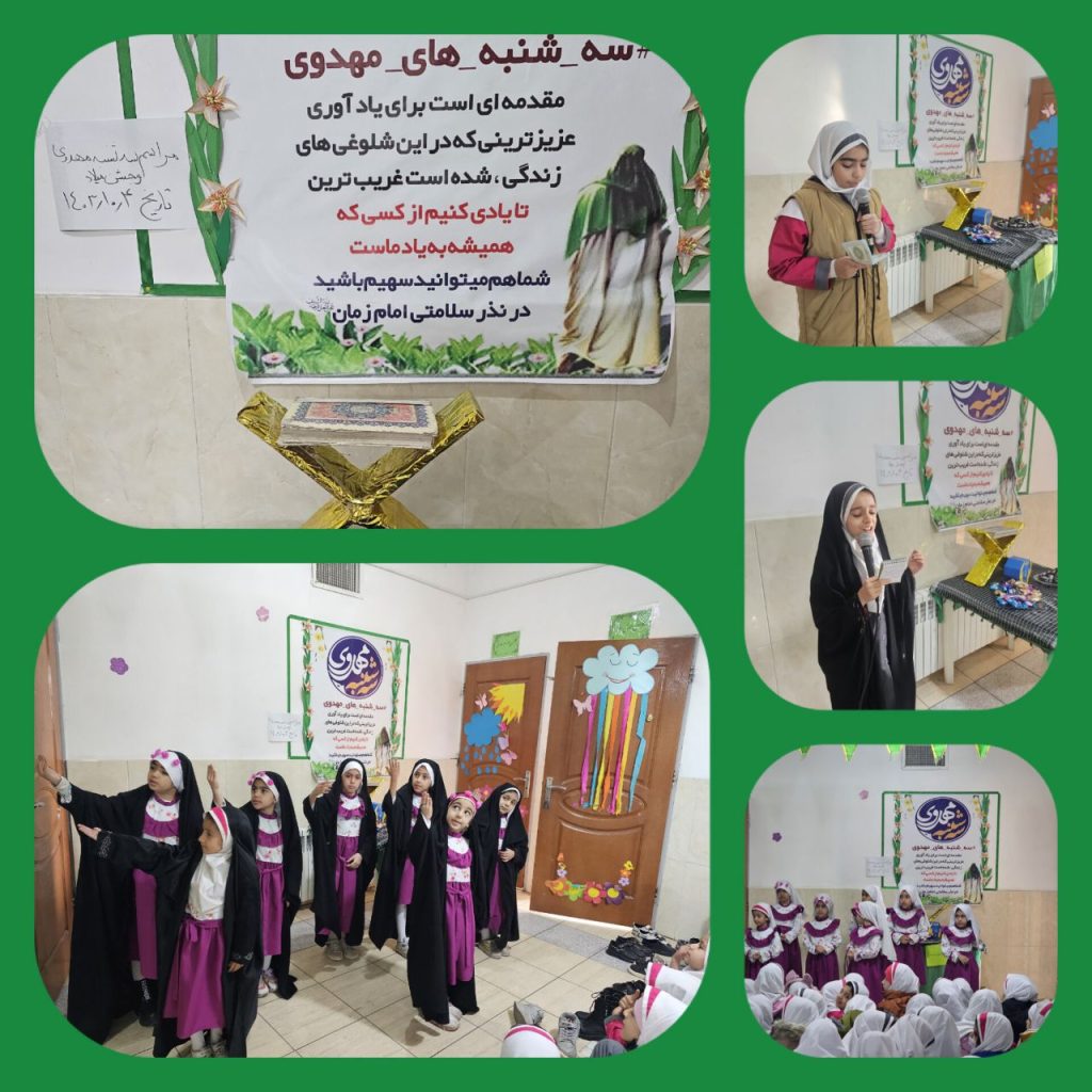 مراسم سه شنبه مهدوی همراه با مراسم میلاد حضرت زهرا(س)بامیزبانی کلاس اولی ها برنامه ها: قرائت قرآن کریم دعای فرج دعای سلامتی امام زمان سرود خوانی کلاس اولیهای عضو گروه ماهور دکلمه خوانی دعای دسته جمعی دانش آموزان جمع آوری صدقات به نیت سلامتی امام زمان پذیرایی از دانش آموزان دبستان